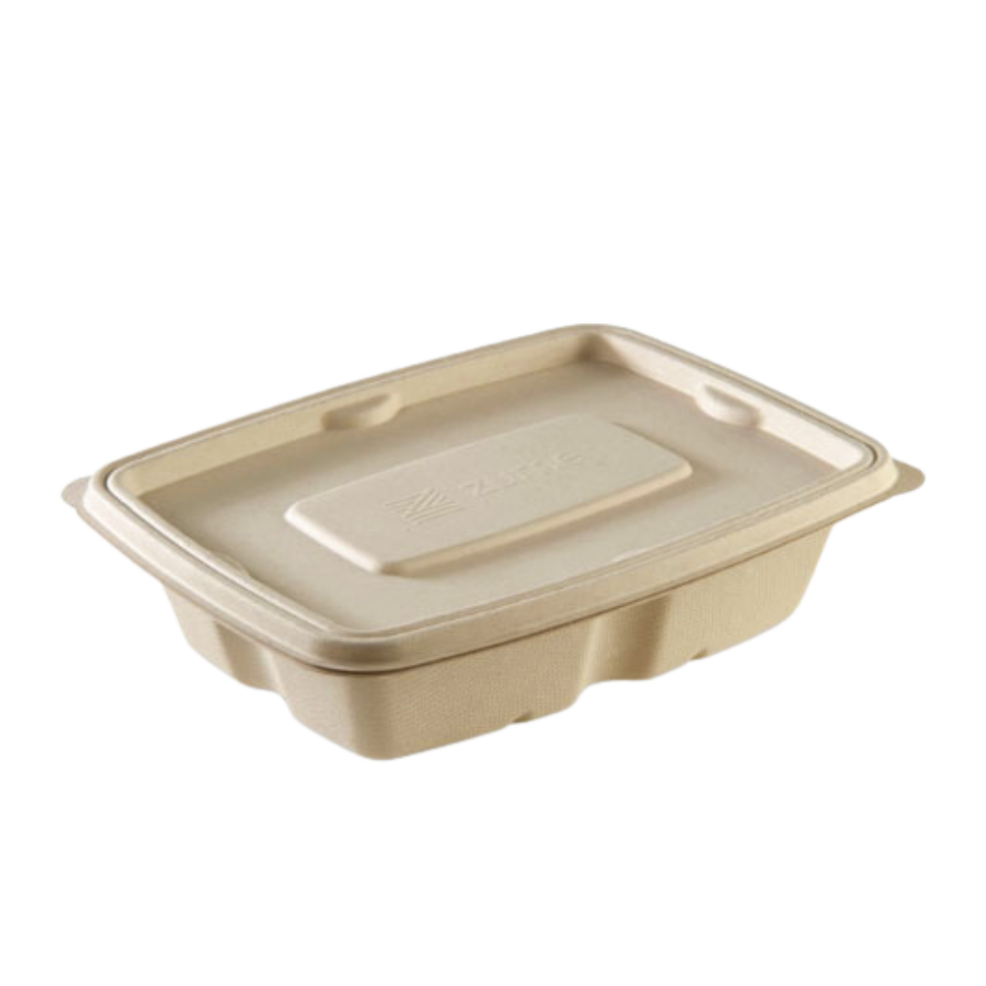 Spacious 750 ml bagasse rectangle container with tight lid, ideal for hearty meals and thali‑style portions, built for leak control and eco‑friendly service.