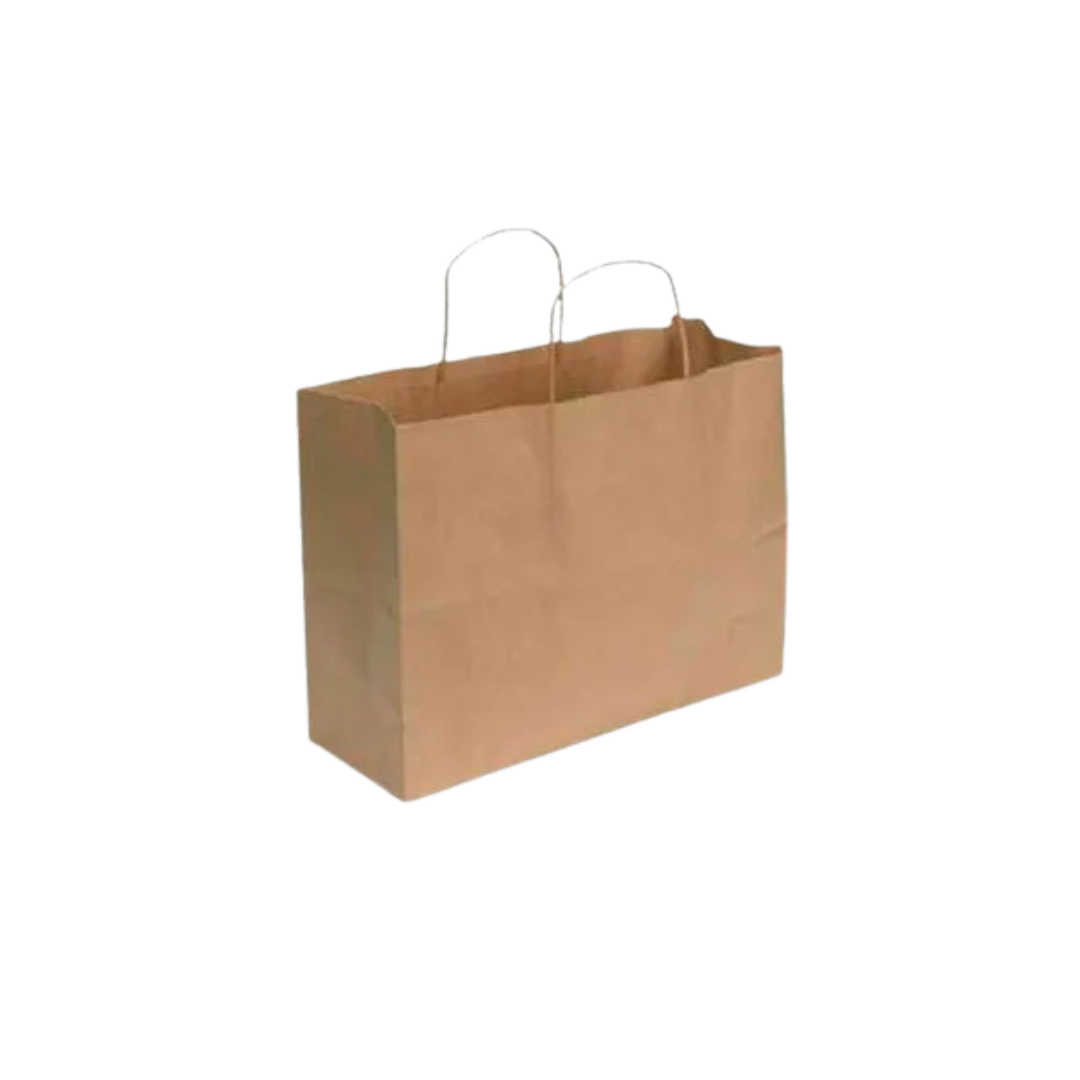 The Size 2×7.9×9 Kraft Paper Carry Bag with Handle is designed for situations where width matters more than height, such as pastry boxes, flat trays and multiple round containers placed side by side. Its broad base ensures stability during transport, while the durable paper handles keep the bag comfortable to carry even when fully loaded.