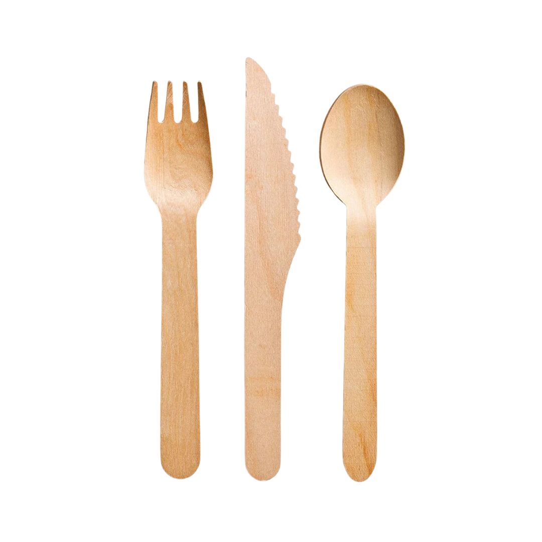 All‑in‑one wooden cutlery kit with spoon, fork and knife, perfect for complete meal boxes, events and catering in a plastic‑free format.